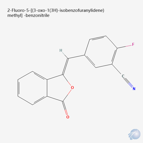 - Preferred IUPAC Name: 2-Fluoro-5-(3-oxophthalidylidenemethyl)benzonitrile/Fluoro-cyanophenylphthalidylidenemethane/FCPPM/2-Fluorobenzylidene-phthalidylidene-5-carbonitrile